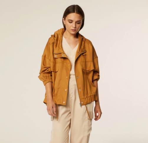 Uno de los modelos más sport de esa temporada. Se trata de una cazadora fluida de corte oversize, con manga larga caída y puños rematados con goma elástica. Además, tiene capucha regulable.