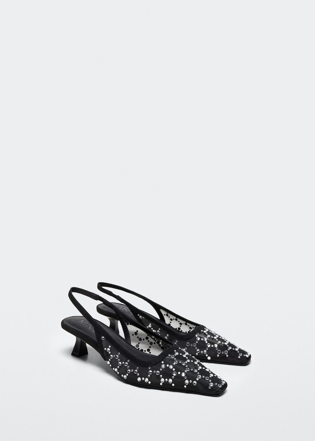 Estos zapatos de Mango con diseño semitransparente, punta cuadrada con abertura y agarre en el talón y tacón estilo kitten te solo 4 centímetros son unos de los tacones más lujosos que te vas a encontrar en la tienda, gracias a su detalle de apliques decorativos brillantes en color plata que contrastan con el tejido negro del fondo. La baja altura de su tacón y su agarre trasero los convierten en un calzado muy cómodo con el que evitar ese molesto dolor de pies de los tacones de aguja altos. Su precio es de 49,99 euros.