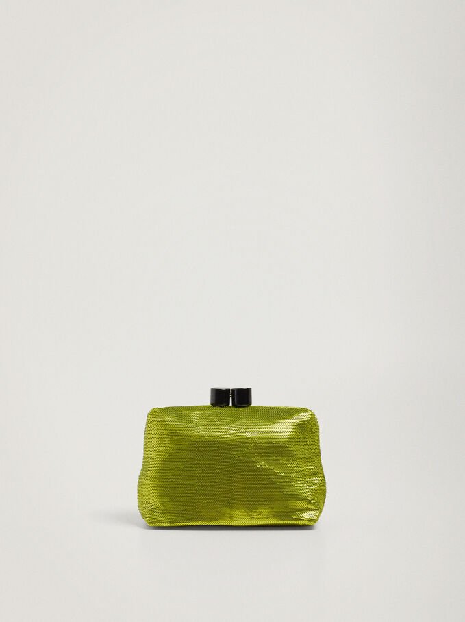 Bolso de mano que también puedes llevar a modo de bandolera con su asa extraíble. Cuenta con forro interior y cierre metálico, y su cuerpo recubierto de lentejuelas le confiere un brillo único.