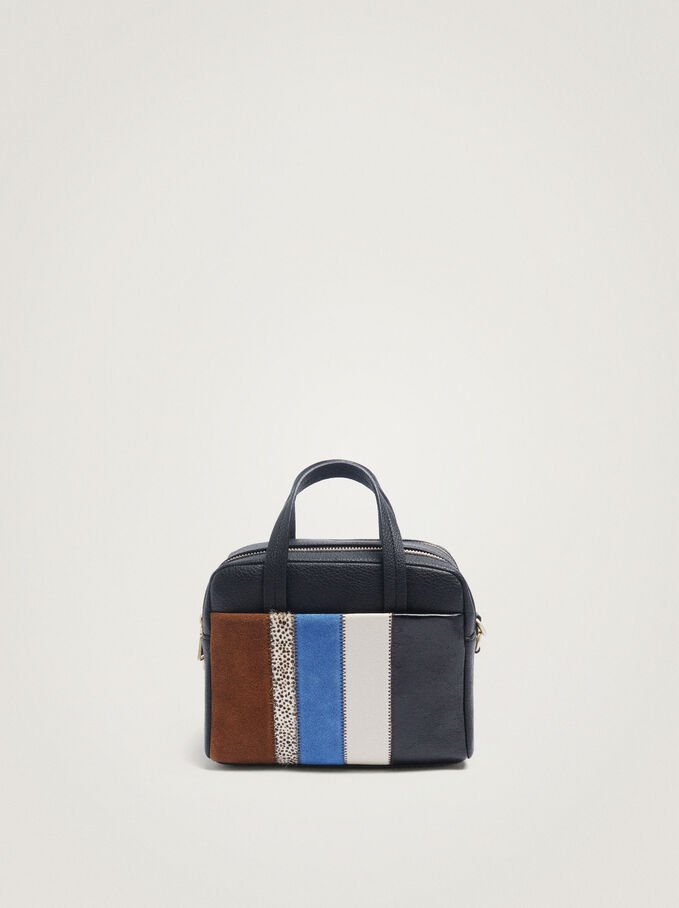 Está confeccionado con un tejido en mezcla de piel y el exterior está decorado con diferentes trozos de tela en colores lisos y estampados, al más puro estilo patchwork.