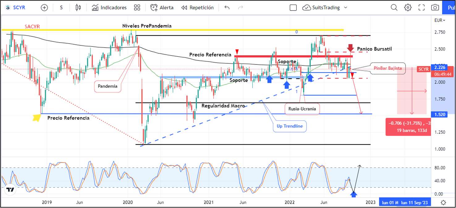 En este caso es donde toma relevancia el análisis de las acciones con gráfico de marco semanal como siempre lo venimos mostrando. El caso de las acciones de Sacyr es un ejemplo claro de la fuerza del mercado bajista el cual, después de haber subido el 158% desde los mínimos creados por la pandemia hasta los máximos registrados este año, comenzó a dar claros indicios de que la crisis le llegó a Sacyr.