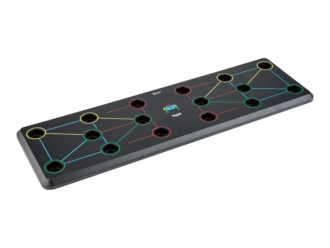 Seguramente hayas visto en la teletienda o en anuncios un aparato similar a este. Es una tabla de flexiones multifunción, para trabajar el pecho desde distintos ángulos. Simplemente colocas las agarraderas en la posición deseada (12 diferentes) y entrenas, algo que te servirá para pecho, tríceps, espalda y otros grupos musculares.