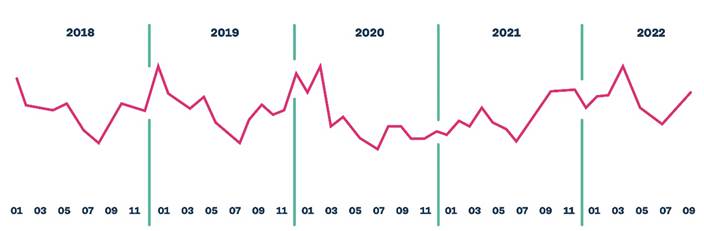 Tras pasar los momentos más duros de la pandemia llegó la relajación progresiva de restricciones en el primer trimestre de este año, lo que ha devuelto a la situación en el punto de partida (patrón estacional con picos en enero, primavera y otoño), pero, tal y como se ha explicado anteriormente, con una demanda mucho mayor y más continuada.