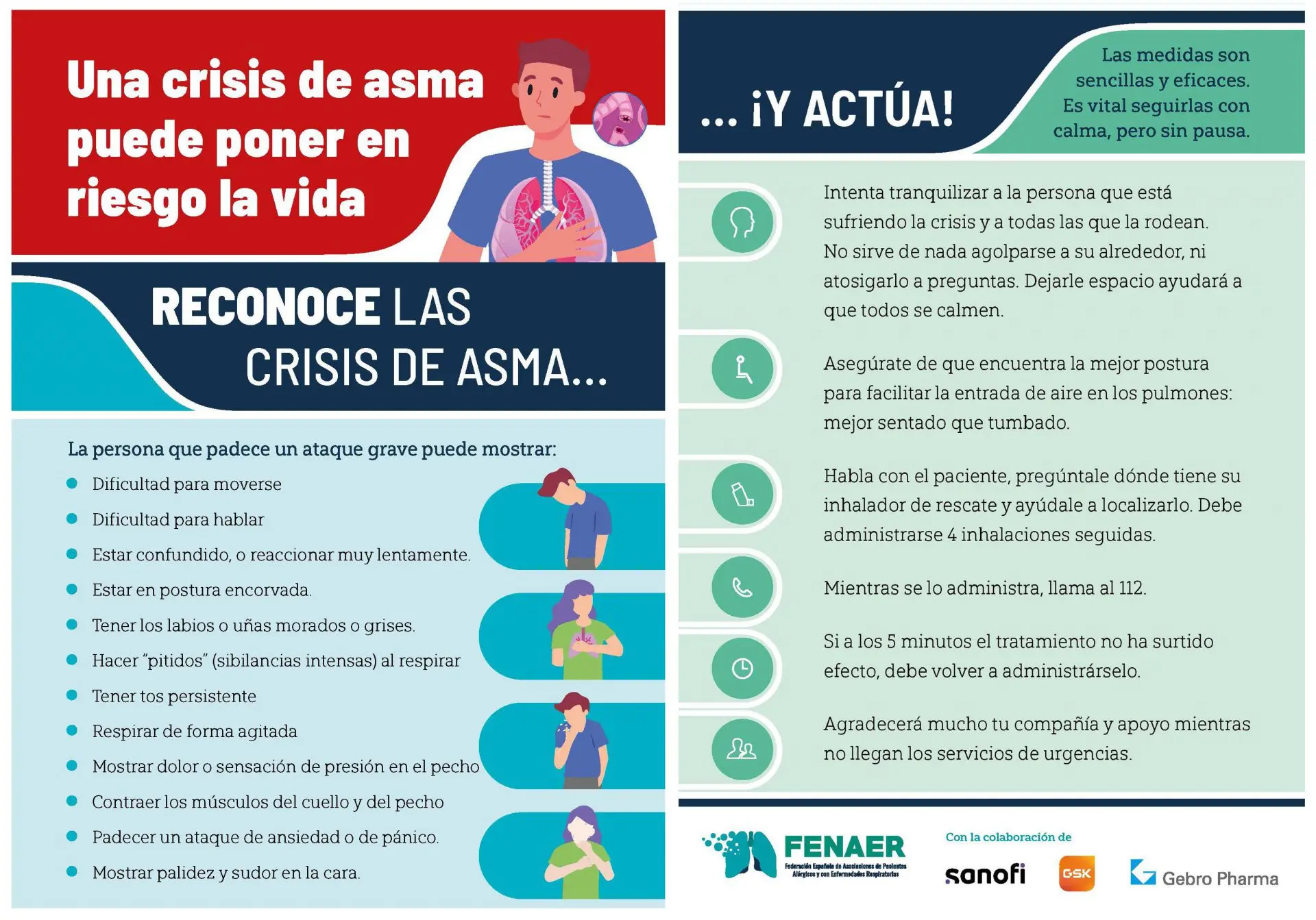 La campaña informa sobre los principales signos de alerta, como dificultad para hablar, respiración difícil y agitada, palidez, tos, labios y uñas azulados o dolor y opresión en el pecho. Una vez reconocida la crisis, hay que actuar rápidamente con medidas sencillas pero que tienen que ejecutarse con celeridad: calmar a la víctima y dejarle espacio, sentarla para que respire mejor, buscar su inhalador de rescate y administrarle cuatro inhalaciones seguidas (repitiendo la operación si a los cinco minutos no mejora) y llamar a emergencias.