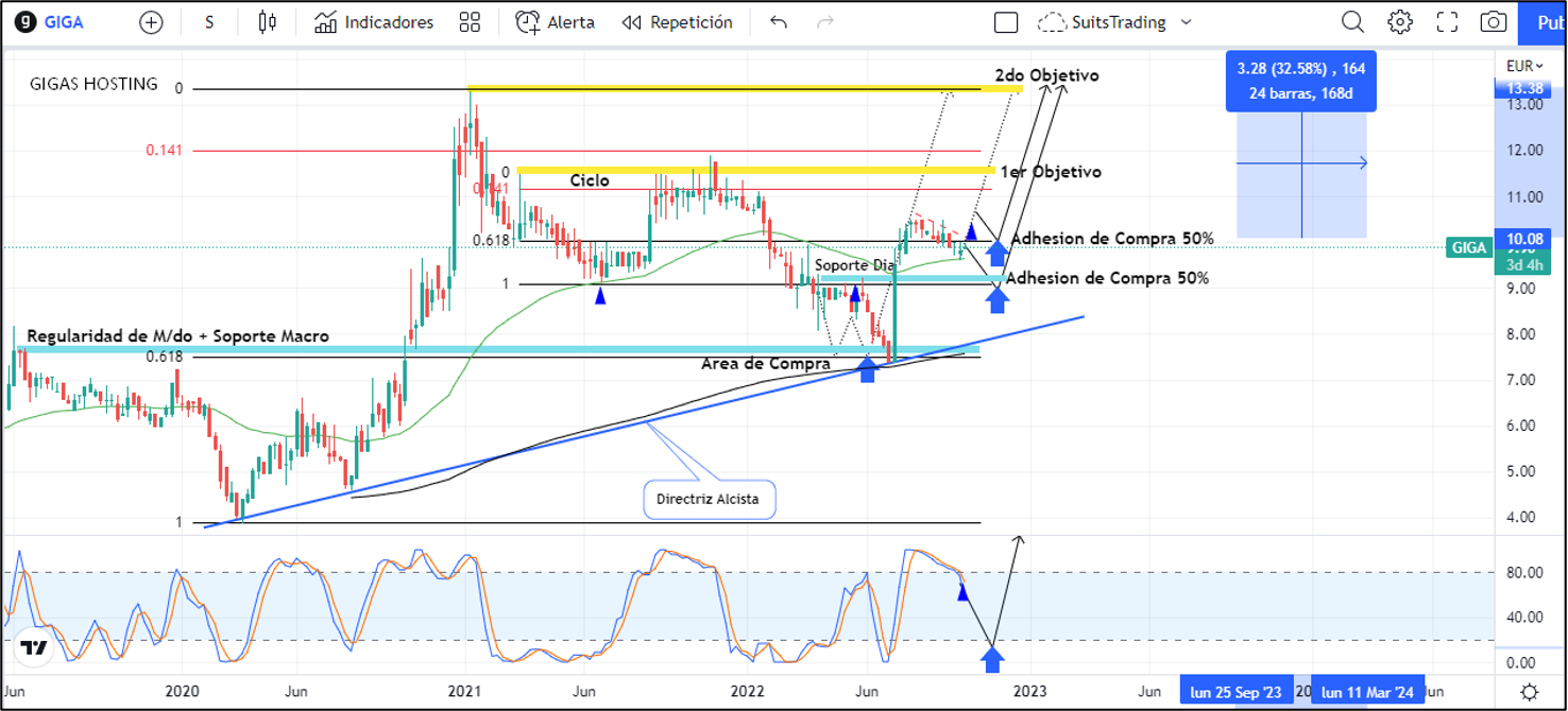 En los artículos anteriores publicados el 26 de junio y posteriormente el 30 de agosto, hemos compartido varias oportunidades de compra y de adhesión en compra para las acciones de Gigas Hosting, las cuales de momento se mantienen en más de un +30% de revalorización. Sin embargo, después del primer estallido vemos un periodo de acumulación bajista que se ubica sobre la media móvil exponencial de 50 periodos de corto plazo. De manera tal que, una vez realice la ruptura al alza de la acumulación, indicaría técnicamente un potencial movimiento al alza que lo lleve a visitar los objetivos planteados previamente.
