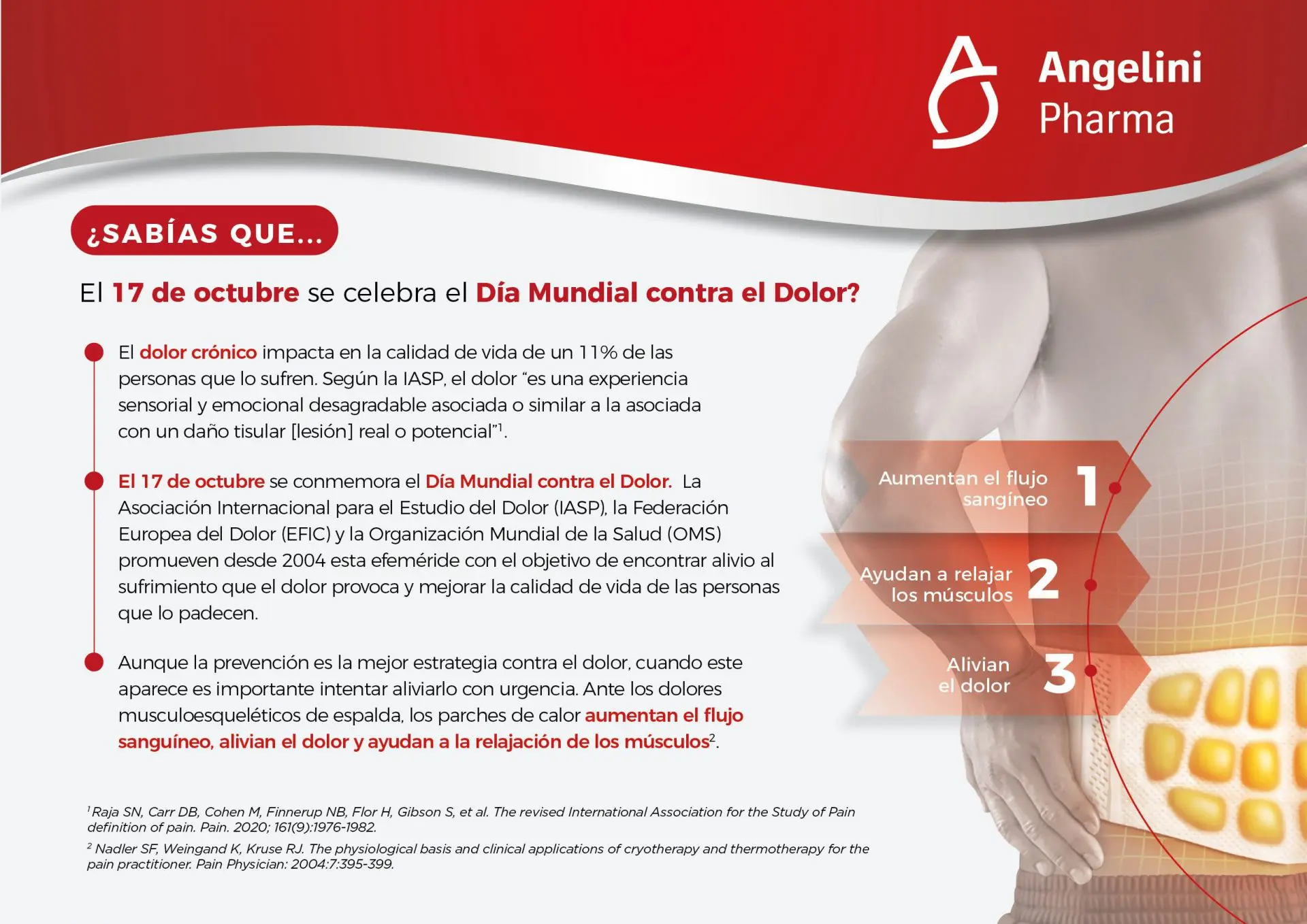 El 17 de octubre se conmemora el Día Mundial contra el Dolor. La Asociación Internacional para el Estudio del Dolor (IASP), la Federación Europea del Dolor (EFIC) y la Organización Mundial de la Salud (OMS) promueven desde 2004 esta efeméride con el objetivo de encontrar alivio al sufrimiento que el dolor provoca y mejorar la calidad de vida de las personas que lo padecen.