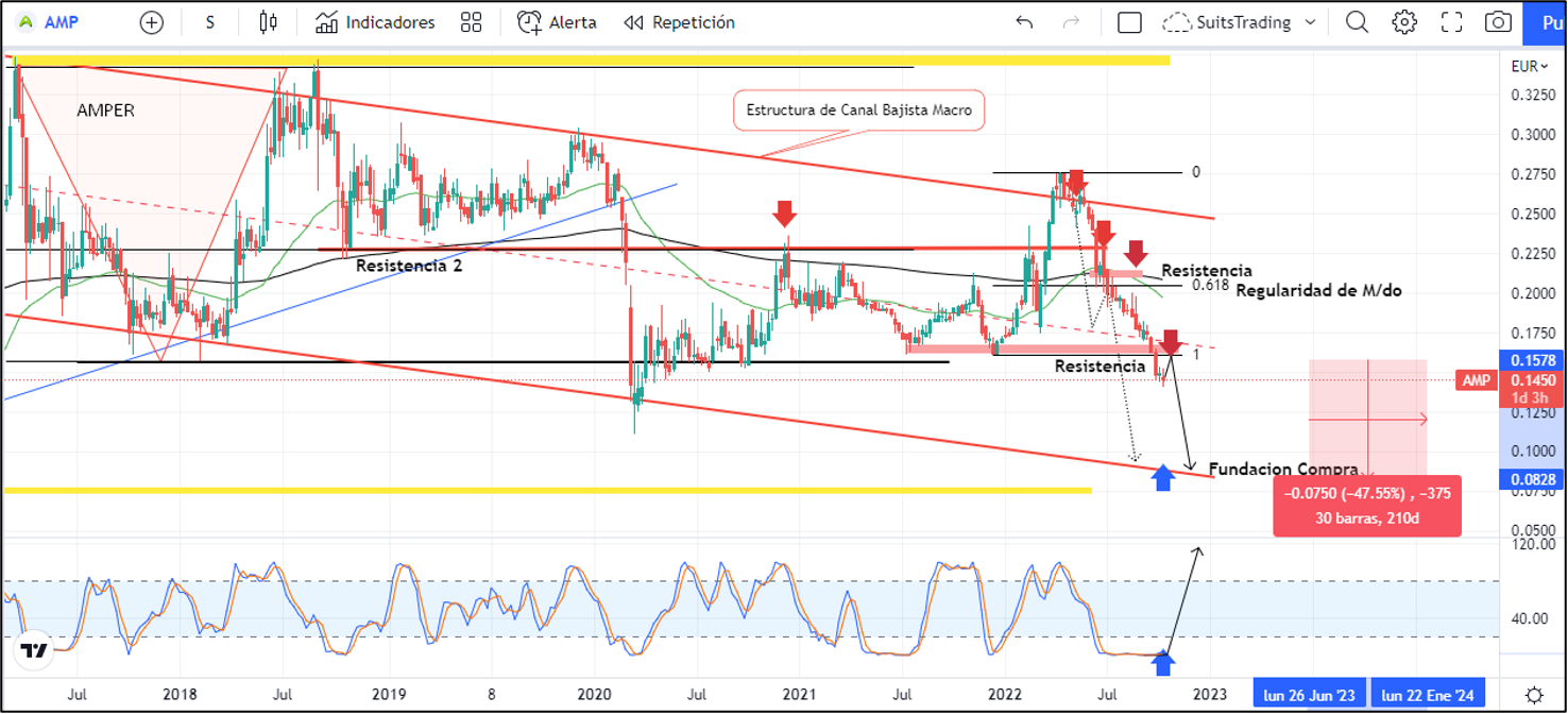 Desde el anterior artículo hasta este momento, las acciones se han desvalorizado poco más del -20% estableciendo a su paso nuevas áreas de resistencia desde donde podemos encontrar mayor presión a la baja. Como podemos notar, los 0,1608 euros marcados en la semana del 21 de julio y 13 de diciembre del año pasado, se convierten en esa área de resistencia que impulsará las acciones de Amper a registrar la ruptura de los mínimos creados por la pandemia.