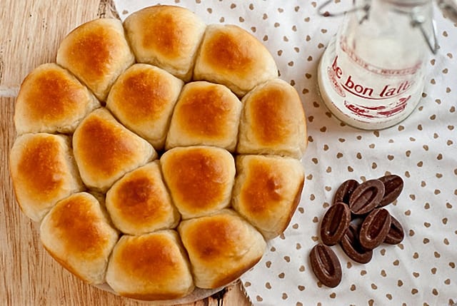 Estos panecillos son muy sencillos de hacer y salen deliciosos. Mezcla 150 gr de leche tibia con 15 gramos de levadura fresca o 5 gr de levadura liofilizada y remueve bien. Añade después 60 gramos de yogur natural, 300 gramos de harina de fuerza, sal, y 40 gramos de miel suave.