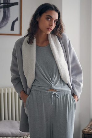 Compuesto por una camiseta de cuello redondo y un pantalón recto, con cintura ajustable mediante lazo y dos prácticos bolsillos en los laterales. Como ves en la foto, la bata con forro de sherpa puede ser su complemento perfecto. Te dejamos otras ofertas.