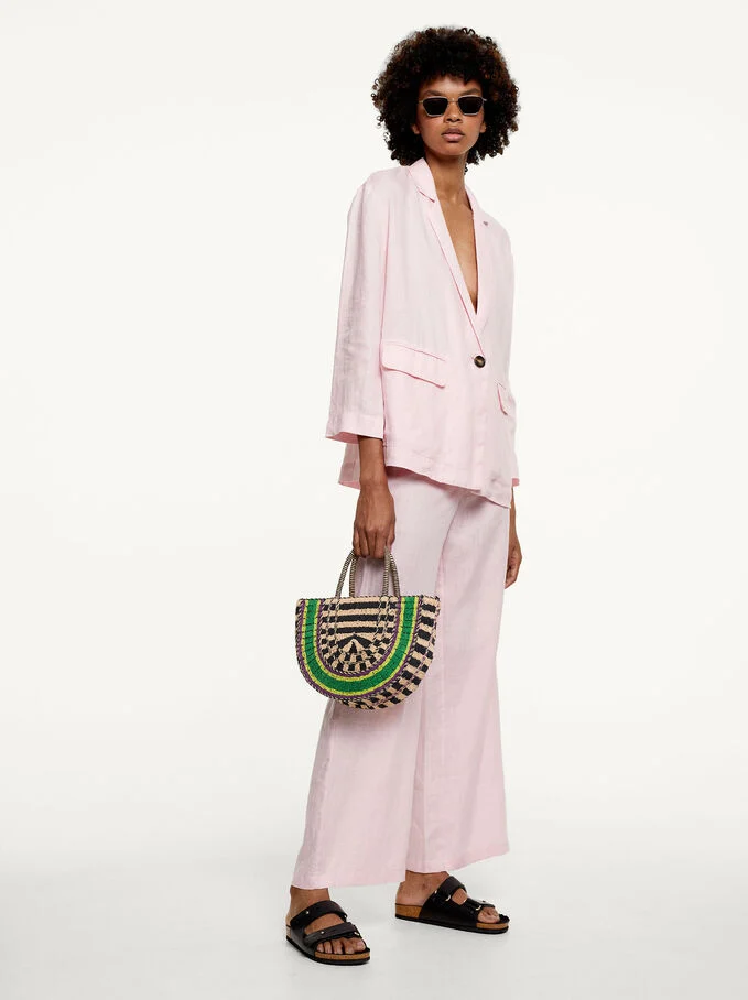 Empezamos con este blazer de Lino. Es un producto hecho en 100% lino, de estilo oversized, cuello de solapa y manga larga. Asimismo, tiene falsos bolsillos en la parte delantera y cierre frontal con botón.