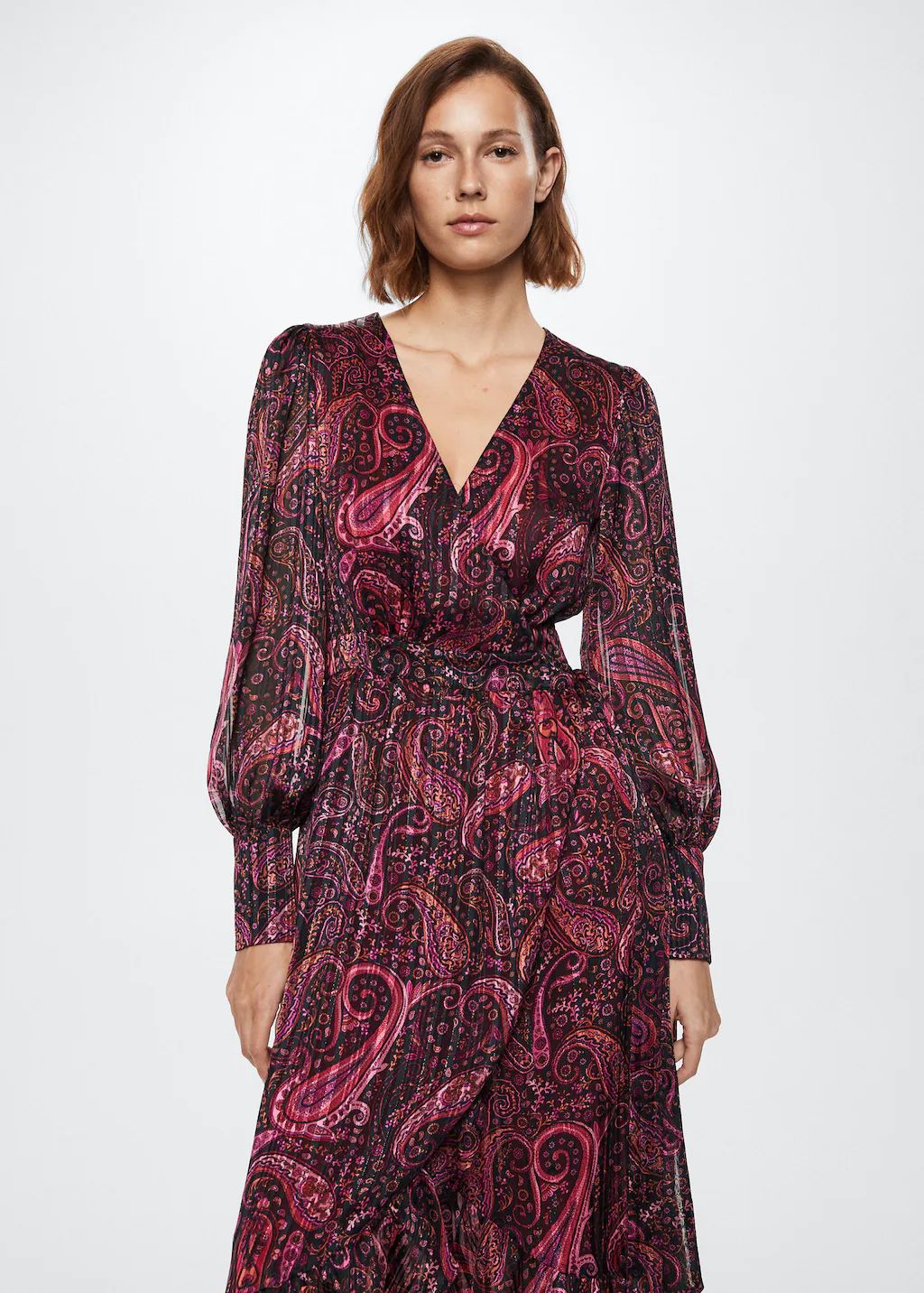 El vestido estampado paisley con volante se está llevando todas las miradas en esta temporada de otoño. Si lo que buscas es un vestido un poco más suelto, pero igual de atractivo, este será tu favorito. Su tejido es fluido y semitransparente, además cuenta con detalles de lúrex. Tiene un escote de pico cruzado y manga larga abullonada. Para una mayor comodidad tiene la cinta en la cintura con cierre de lazo. Su precio es de 69,99 euros.