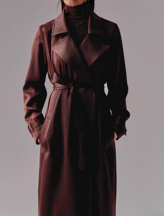 Abrigo largo de primera calidad, confeccionado con detalles tradicionales como el cuello solapa, el cinturón a juego y los bolsillos laterales. Con acabado de tacto satén y disponible en marrón chocolate y beige. ¡Veamos otras prendas novedosas!