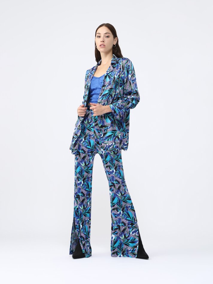 Por último, te mostramos este conjunto de Lefties compuesto por un pantalón largo de cintura semielástica, cierre de cremallera y botón a contraste, pernera ancha y aberturas en los najos, combinado una blazer fluida de doble abotonadura y cuello solapa. Ambas prendas están confeccionadas en un cómodo y fluido tejido satinado con un fresco y original estampado en todos azules. El precio de cada prenda es de 19,99 euros.