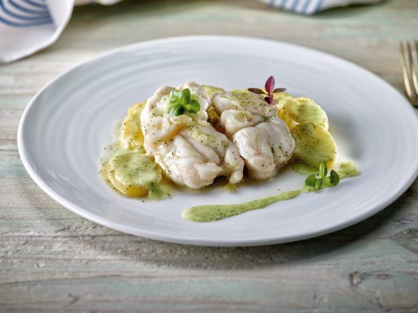 Por un par de rodajas de pescado para cada persona, y añade alrededor unas almejas o unas gambas o langostinos. Riega con un poco de salsa por encima y asegúrate de que los bordes del plato están limpios, porque la salsa suele manchar.