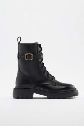 Un botín de inspiración militar que se ajusta mediante cordones y que tiene detalle de hebillas en el alteral. Gracias a ellos puedes darles un aire un poco más rompedor a tus estilismos con vestidos de corte muy femenino.