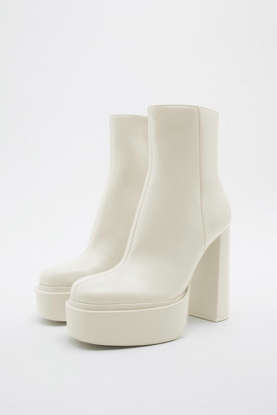 La firma de moda low cost nos lleva de vuelta a los 90 con este original par de botines de efecto piel, con punta redondeada y un tacón altísimo que no supondrá un problema gracias a su plataforma XXL.