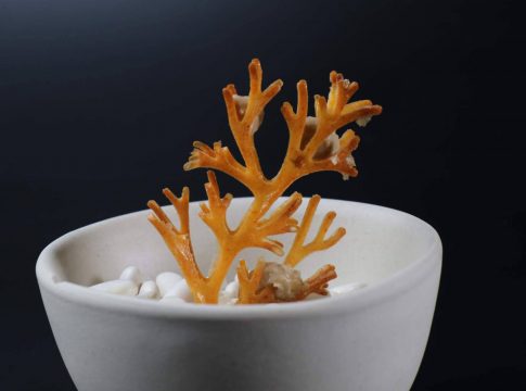 Por su parte, el chef José Antonio Sánchez Torres, uno de los grandes referentes de la cocina alicantina abriría el menú con su ‘bienvenida con olivos milenarios’, haciendo referencia a los olivos plantados en la finca donde se encuentra Els Vents, unos espectaculares olivos bi-milenarios, y que incluía ‘vermut de cuchara, gordal y naranja ‘, ‘royal de boquerones, gordal y patatas crujientes’, y ‘yema de hongos, nuez y praliné de gordal’. Siguió con una emocionante ‘quisquilla en escabeche de su agua en otoño y cabeza en llamas’, y un ‘bombón de su coral con traslúcidos de hongos’. También del mar un ‘rape negro en suquet oscuro y templado, crema de su lomo embotado, su foie asado y un curry de berros ‘. Quiso Sánchez llevar la carne nipona a su menú con ‘Kobe, cucurrones en su guiso, torrefactos y jugo de legumbres especiadas’ y terminó con el postre ‘citrus, con lima, limón, caramelo, coca boba en glaseado de donut y una compota de cítrico’.
