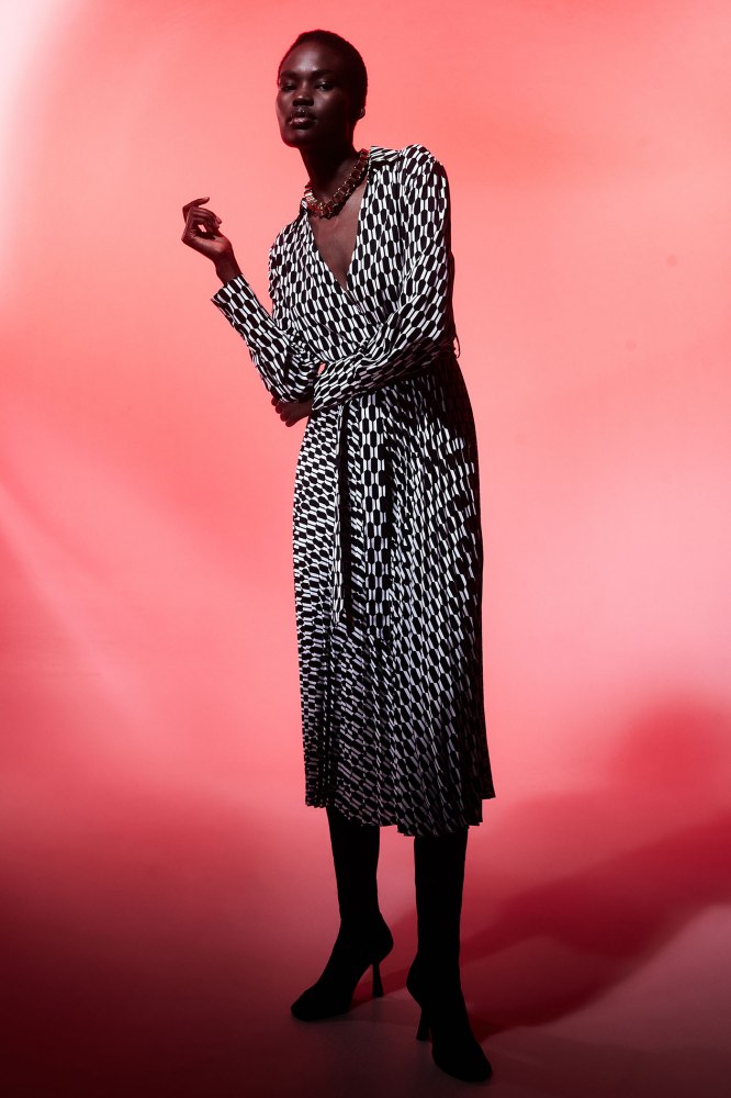 Un vestido de corte midi con un original estampado geométrico. Escote en forma de “V”, con manga larga ajustada mediante botones en el puño y cinturón a juego confeccionado en el mismo tejido.