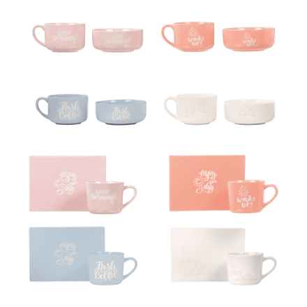 Hay varios diseños y modelos. Puedes elegir la versión con taza y bandeja, o bien la que lleva taza y cuenco. Con el precio que tiene, incluso puedes hacerte con varios juegos, uno para cada día de la semana.