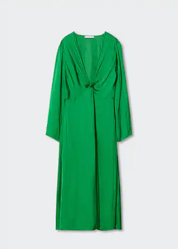 Si tienes una boda a la vista, no puedes dejar escapar este preciso vestido de Mango en color verde, confeccionado un tejido fluido y acabado satinado, con diseño midi evasé, escote pico cruzado y abertura en la parte delantera. Decimos que es perfecto para una boda de invierno porque, gracias a su manga larga y a su forro interior, es un vestido con la que no vas a pasar demasiado frío y que no necesariamente debe llevar una prenda de abrigo por encima. Su precio es de 59,99 euros.