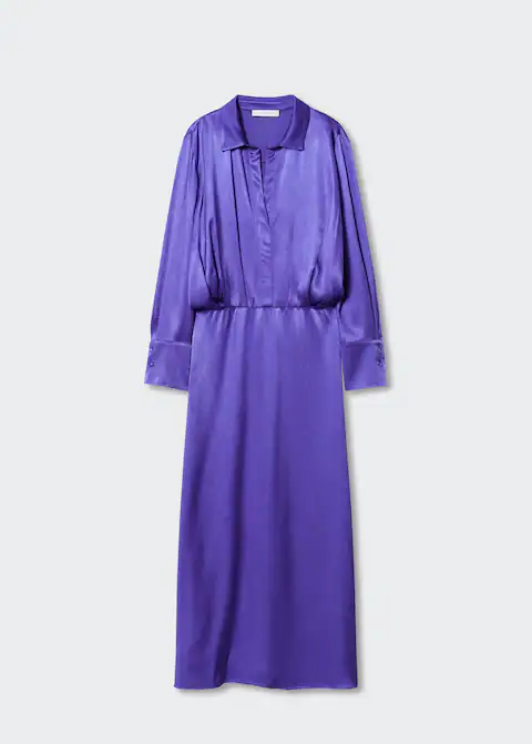 Por último, os traemos este precioso vestido camisero de Mango confeccionado con tejido fluido y satinado, de diseño largo y recto, cuello camisa, manga larga abotonada, aberturas delanteras en el bajo y detalle de pinzas, perfecto para llevar a una boda o un evento y ser la invitada más original y sofisticada. Su precio es de 59,99 euros y está disponible tanto en color morado como en rosa fucsia.