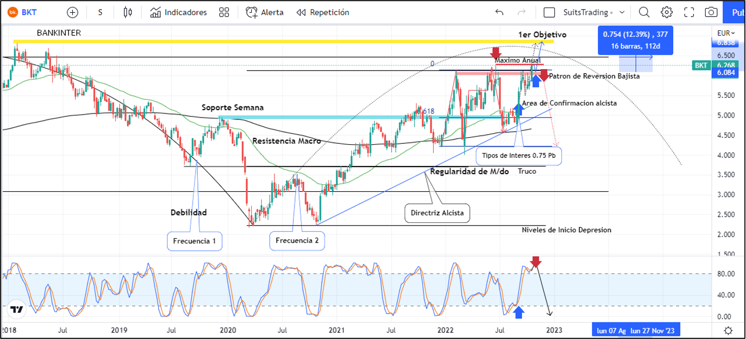 No obstante, el precio visita de momento los máximos anuales registrados el 21 de junio los cuales representan la posibilidad de retrocesos a modo de doble techo que, de visitar y respetar el soporte establecido por el mismo patrón en inmediaciones de 6,08 euros, promueva ese impacto adicional el cual estaría apoyado de los resultados financieros entregados por Bankinter, pero cuidado, el patrón macro no es alcista. Si en un evento dado, el precio de las acciones de Bankinter se ubica nuevamente por debajo de los 6,08 euros, estaría activando el patrón de reversión bajista que podría desplomar las acciones de Bankinter hasta en un -30% a niveles de 4,1 euros.