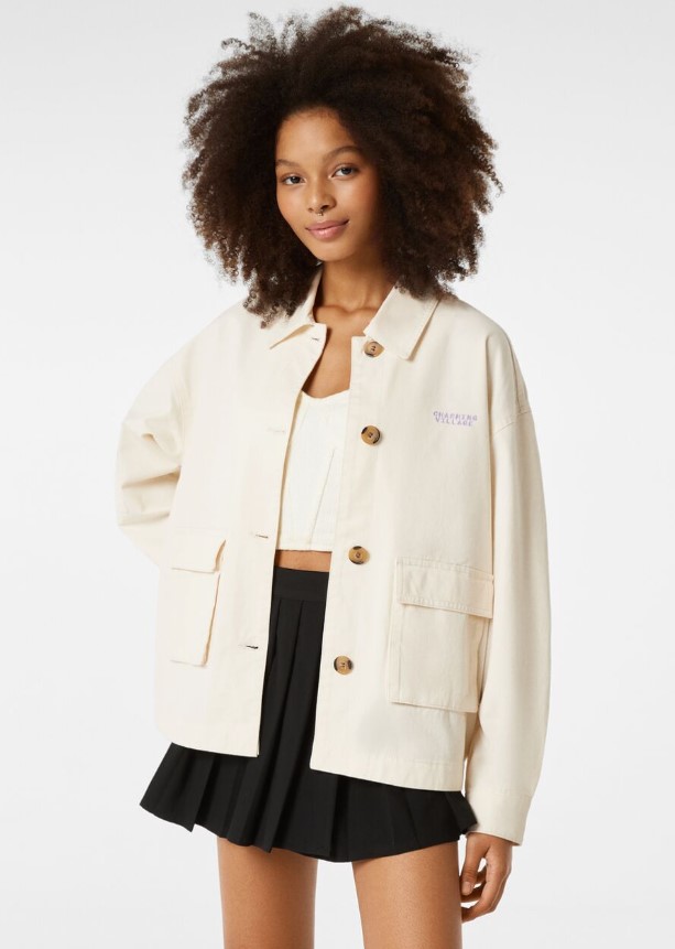 Seguimos viendo chaquetas de Bershka muy modernas y juveniles para usar esta temporada de otoño/invierno. Vimos esta cazadora estilo trucker, de algodón con print en la espalda. Es en color crudo y tiene cierre mediante botones en color marrón. Además, cuenta con dos bolsillos y un tercero sobre una manga. Está disponible en la tienda en las tallas que van desde XS al L y el precio de venta es de 35,99 euros.