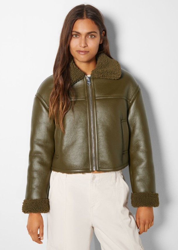 Por último, te mostramos otra chaqueta de Bershka moderna y juvenil para usar esta temporada de otoño/invierno. Vimos esta cazadora corta de doble faz y de efecto piel. Se trata de un diseño en color kaki y que cuenta con forro interior, todo confeccionado en 100% poliéster. El cuello está confeccionado en tejido de borreguillo que además de aportar suavidad y calidez, crea un buen contraste con el efecto piel del resto de la chaqueta. Está disponible en la tienda en las tallas que van desde XS al L y el precio por el que puedes hacerte con esta chaqueta es de 45,99 euros.