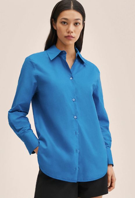 Las camisas popelin son ideales para ir al trabajo. Pero sobre todo lo es esta que hemos visto en el catálogo de Mango, porque además de ser muy bonita, en parte por su cuello camisero, tiene un diseño oversize que combina casi con cualquier tipo de prenda. Tiene un sistema de cierre de botones en la parte delantera y un precio que es muy tentador. Solo cuesta 25’99 euros.