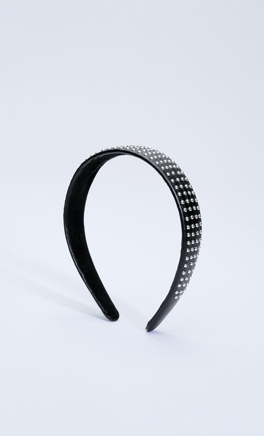 Dale un aire un poco más punk a tu estilismo con esta sencilla diadema de Stradivarius. Un diseño de ancho medio, en color negro, y en el que destacan las tachas plateadas que recorren toda la superficie.