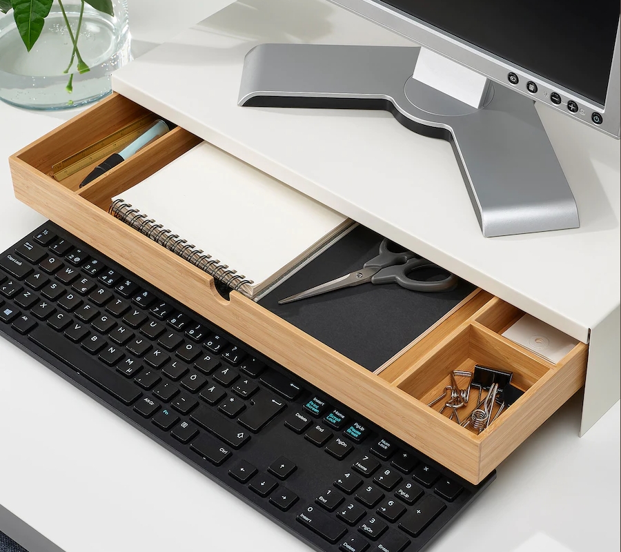 Si buscas ahorrar espacio, Ikea también tiene esta práctica base para el teclado de tu PC. Esta base te permitirá despejar el escritorio, guardando el teclado bajo ella. Además, podrás colocar el monitor sobre ella y cuenta con una práctica cajonera.
