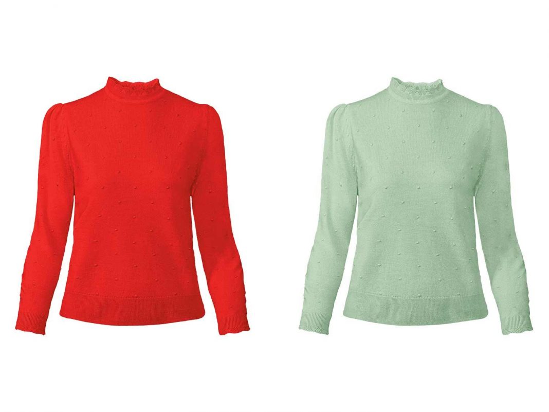 Otro jersey con un diseño absolutamente a la moda, disponible en Lidl es este modelo con cuello alzado con acabado ondulado, muy femenino. Las mangas son tipo globo con elástico en los puños y acabado ondulado también. Estos detalles hacen que un jersey básico de corte sencillo se convierta en algo mucho más original. Es ancho y cómodo, con elásticos en el bajo, y un tejido muy suave al tacto. Se puede elegir entre dos alegres colores: verde y rojo, y hay tallas desde la S a la L. Tiene un precio de solo 7,99 €.