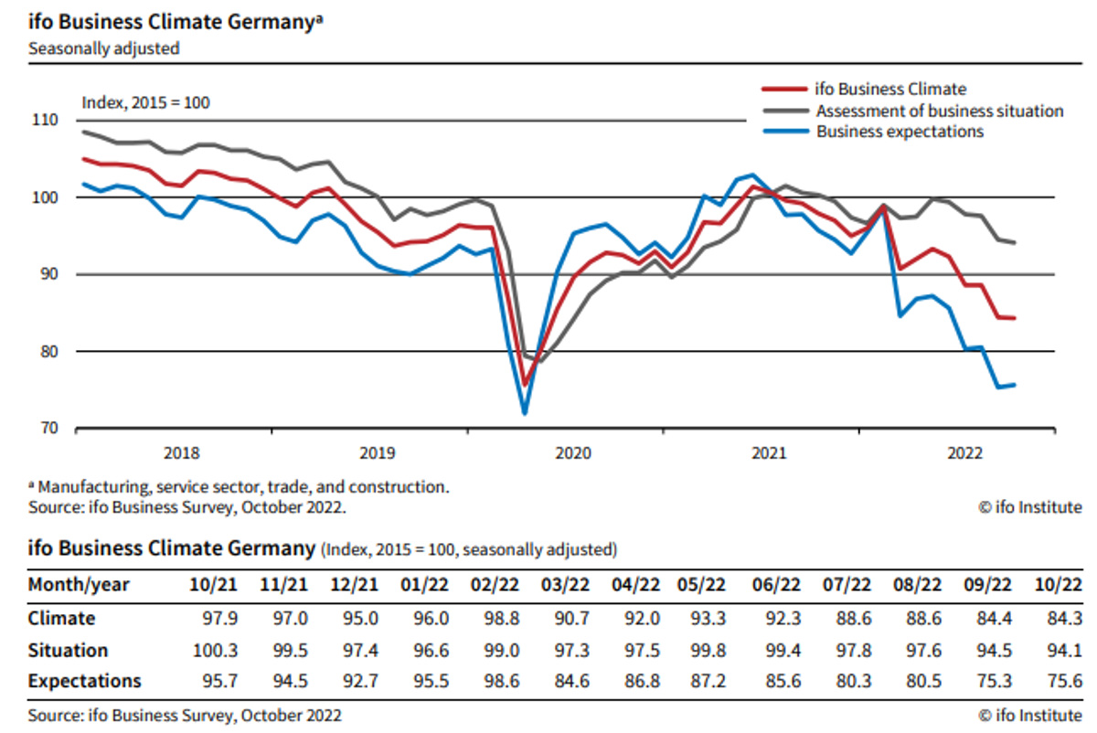 Este dato de S&P Global no es el único que aterra a la economía alemana. Este mismo martes se ha conocido el Ifo, cuya lectura es la más baja desde 2020. El clima empresarial refleja un pesimismo similar al confinamiento de 2020. «El sentimiento en la economía alemana sigue siendo sombrío», ha sentenciado Clemens Fuest, presidente del Instituto Ifo. Y es que, el dato es de 84,3 puntos en octubre, una décima inferior al de septiembre. Sin embargo, el dato es mejor del estimado por el consenso del mercado, que esperaba una caída a 83,5 puntos.