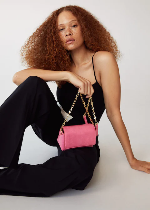 Otro bolso atractivo, en tamaño pequeño, fácil y cómodo de portar, que tiene Mango en sus tiendas, es el Bolso solapa cadena. Con una delicada y fina cadena que podrás portar en tu mano o en tu hombro y cierra con botón imantado en la solapa.