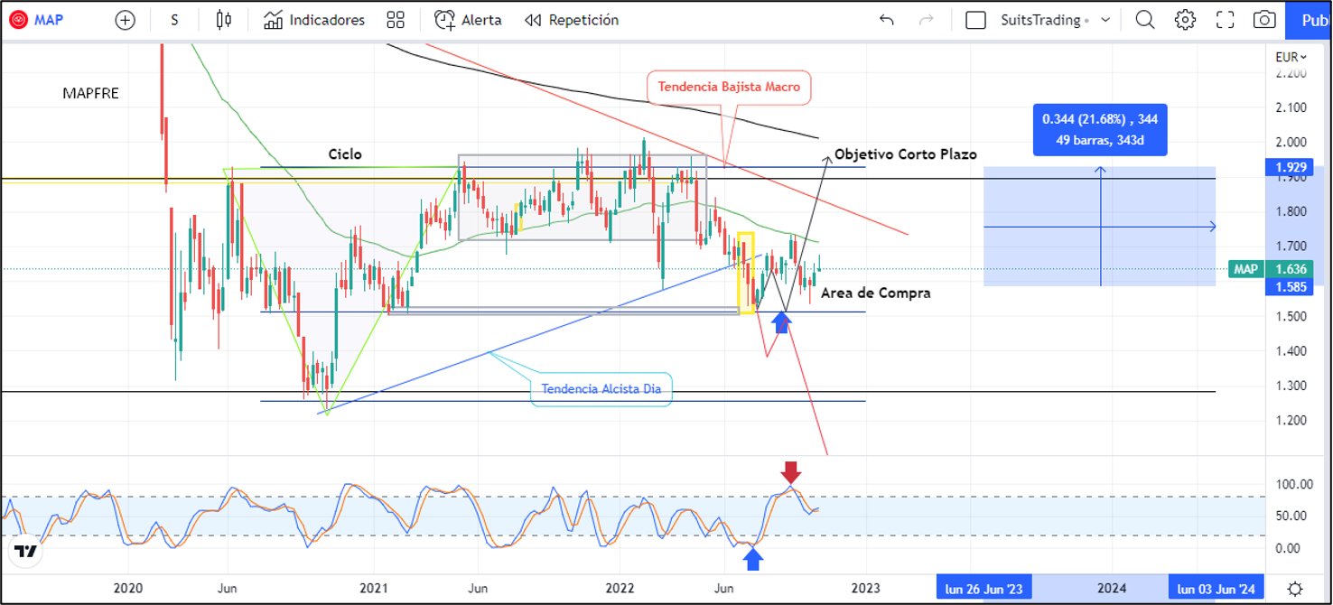 Para las acciones de Mapfre es viable una revalorización entre el 12% y el 20% desde los precios actuales, oportunidad que, de ejecutarse, no debería ser superior a un 30% del total invertido en riesgo en línea con lo comentado en el artículo del pasado 11 de agosto. Históricamente las acciones de Mapfre se mantienen trabajando en correlación a la directriz bajista creada desde mayo de 2017 y en este recorrido ha desarrollado un patrón bajista que genera mayor presión para llevar el precio de las acciones a mínimos de 2012 y que se repitieron en octubre de 2020 con la llegada de la pandemia en inmediaciones de 1,2 euros por acción como primera medida. Seguimos repitiendo que, de visitar esos niveles y realizar una ruptura sólida de dicha área (1,2 euros), buscará como objetivo niveles de 0,78 euros, es decir, un desplome de más del -50%.
