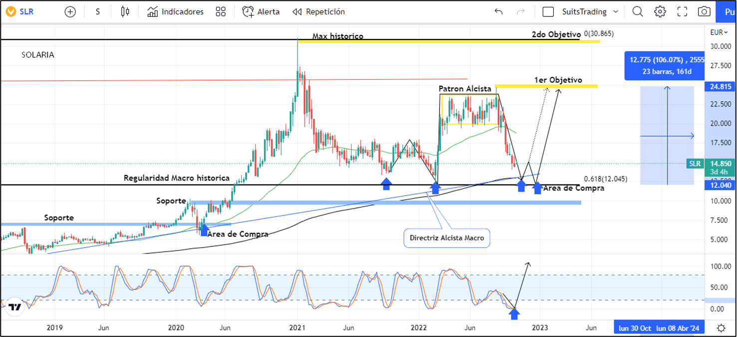 Como lo comentamos al inicio del artículo, las acciones de Solaria deberán caer un -18% adicional hasta visitar el área de regularidad de toda la subida historia que el precio desarrolló desde 2012. Muy probablemente buscará los 12,2 euros por acción donde confluyen niveles mínimos establecidos en 2022, el 61,8 de retroceso de Fibonacci de toda la extensión histórica, la directriz alcista macro que se viene formando desde octubre de 2018 y la media móvil exponencial de 250 periodos de largo plazo. Ubicar el precio en esta área donde confluyen todos estos factores más la ubicación del índice de fuerza relativa en niveles extremos de sobreventa, constituirán oportunidad alcista en las acciones de Solaria.