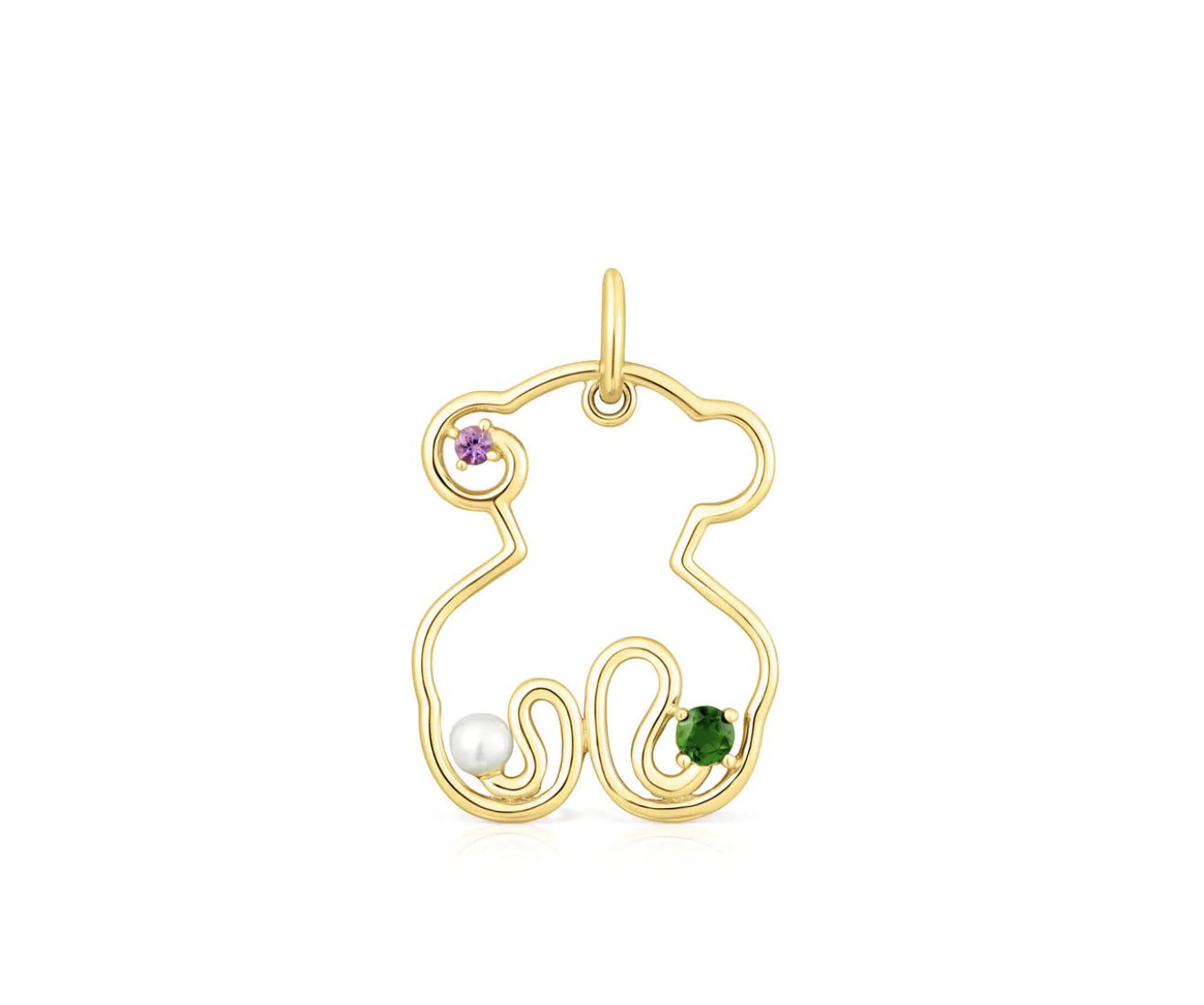 Tous siempre ha destacado por la originalidad de sus diseños de joyería. El oso nunca debe ser el mismo, debe cambiar como lo hacen las tendencias. Sin duda destacarás con esta versión ornamental del oso, el colgante mide 22 mm y tiene en sus patas y orejas 4 gemas amatista y cromodiópsido respectivamente.