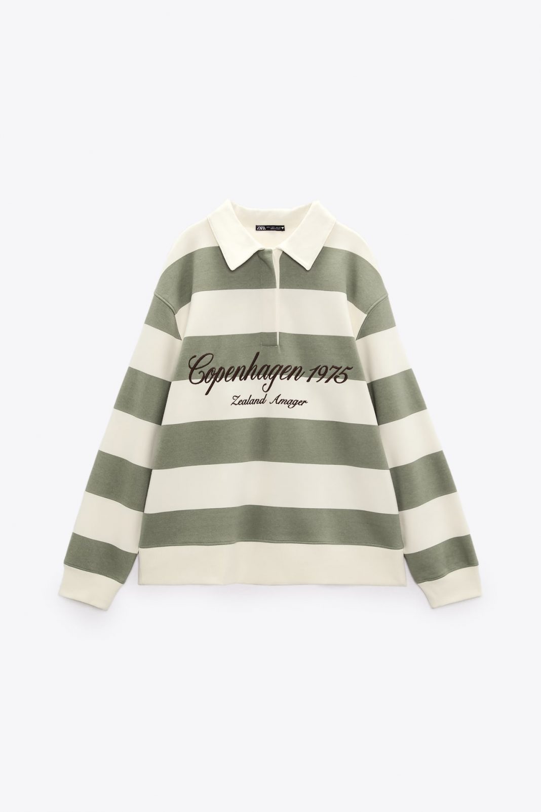 En Zara las sudaderas tamboén deben ser un sinónimo de elegancia, por eso está de cuello polo es perfecta para una comida en el restaurante más top de tu ciudad. Es un diseño perfecto porque gracias al lettlering con la frase “Openhagen 1975” cambia totalmente la función de sudadera de rayas para ofrecerle un toque muy de prendas llevadas por la realiza, en un día de campo casual.