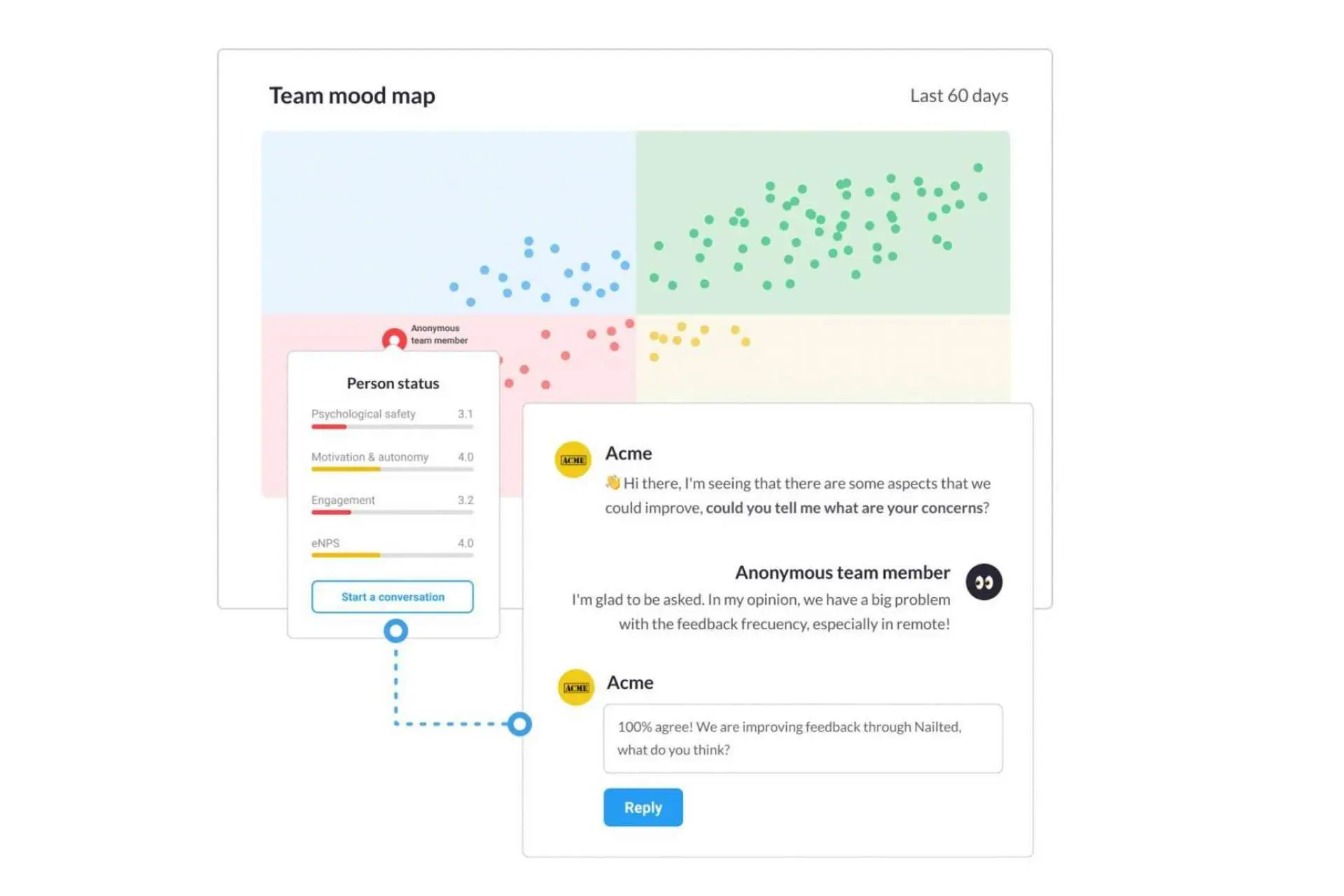 Es importante instaurar procesos de feedback que ayuden a las empresas a entender mejor cómo se sienten sus empleados y a actuar en consecuencia para mejorar su experiencia y, como consecuencia, la cultura de empresa. Nailted permite lanzar encuestas de satisfacción laboral, con capa de anonimidad, totalmente automatizadas para impulsar el cambio real en las organizaciones. Las encuestas son una herramienta perfecta para crear una cultura de feedback ya que ofrecen a los empleados un entorno seguro en el que hablar acerca de sus intereses, necesidades y preocupaciones.