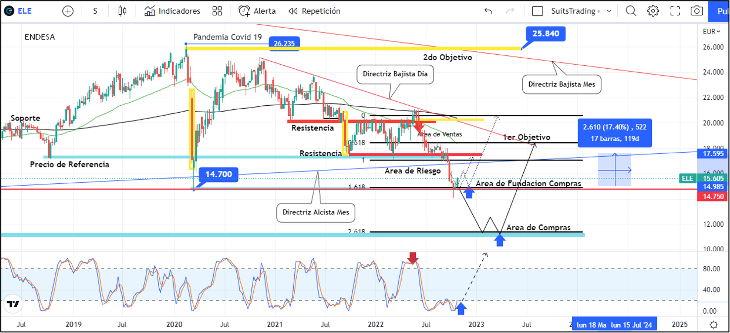 Por otro lado, si el precio de Endesa logra ubicarse sobre los 14,7 euros preferiblemente en formación de truco, es decir, V invertida dando señal del fin de las caídas, potenciaría el movimiento alcista inicialmente al área de resistencia localizada en inmediaciones de 17,3 euros que se considera una fuerte resistencia al haber sido un triple piso.
