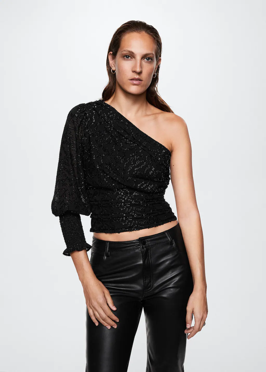 Con esta blusa asimétrica puedes crear un look de fiesta sofisticado combinándola con un pantalón de vestir o una minifalda. O bien puedes darle un toque más casual con unos vaqueros ajustados. El diseño es crop con detalles drapeados, muy a la moda. Tiene una sola manga con un puño elástico y fruncido muy original. El tejido es fluido, de color negro, con muchos brillos. Lleva un forro para que sea más cómodo. Además, pertenece a la colección Commited, que significa que ha sido confeccionado con procesos sostenibles. Puede ser tuyo por 25,99 €.