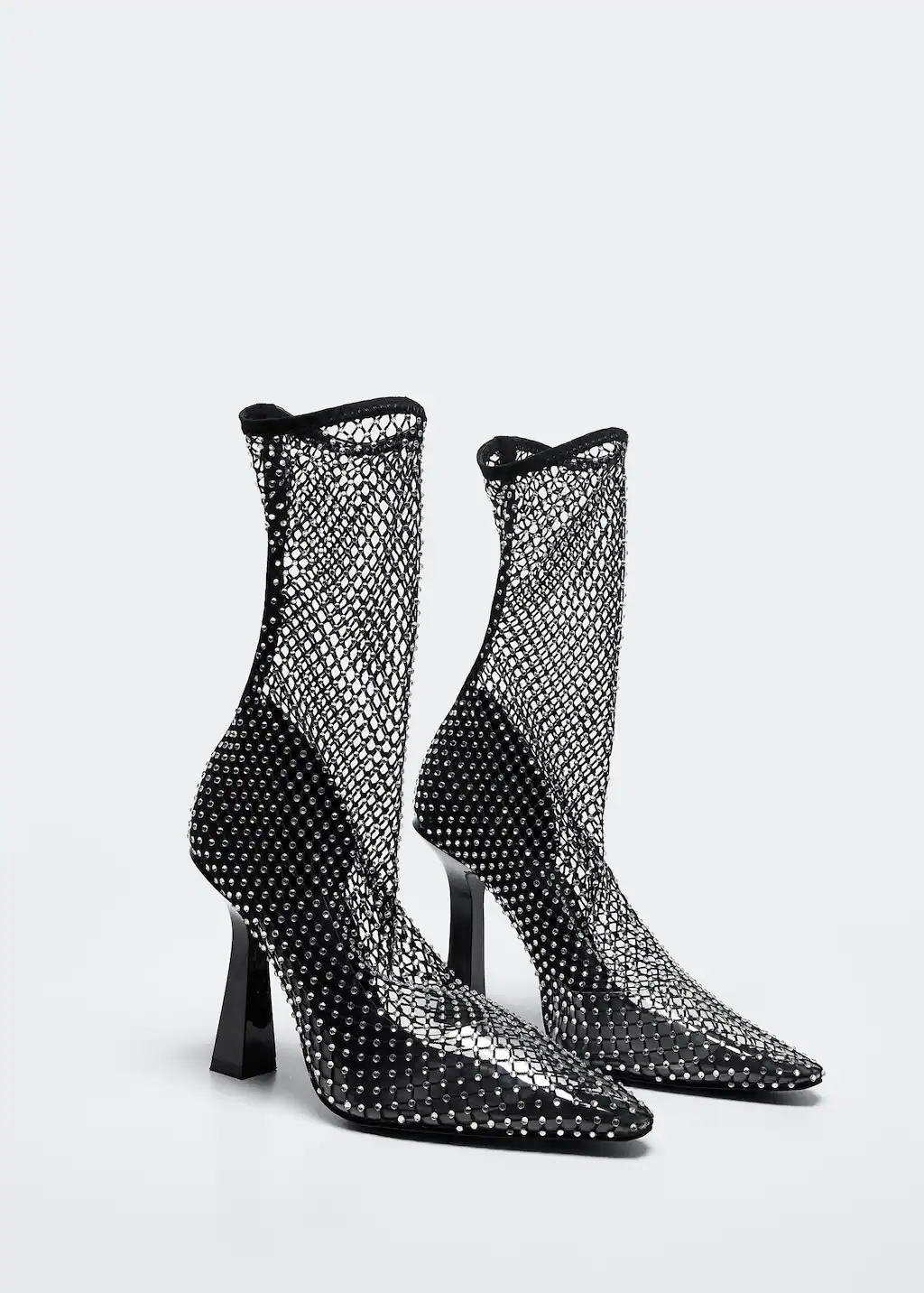 El calzado de fiesta de Mango también destaca con propuestas espectaculares como estos botines de malla destinados a convertirse en los protagonistas del look. Son de caña media, con forma de punta y tacón de aguja de 10 cm. y tienen un diseño de malla plateada hecha de poliéster, que deja entrever el pie como si fuese una sandalia. Si buscas un calzado impresionante, este es. Puedes incluirlos en tu colección por 69,99€.