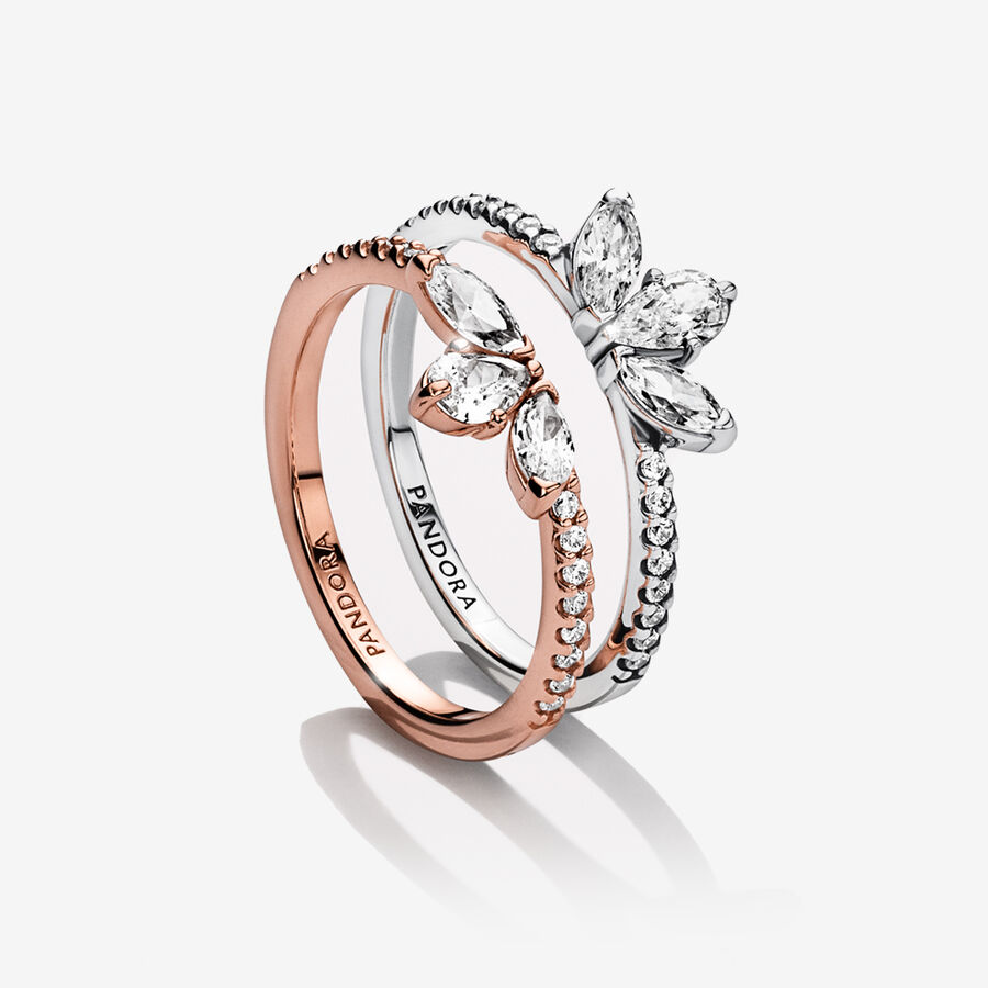 No existe una pieza de joyería más romántica que este conjunto de anillo de Pandora, que resaltan por la combinación de plata de primera ley con oro rosa de segunda ley. Si destacamos los característicos detalles de las piezas, nos encontramos con dos anillos que al unir sus gemas centrales en forma de pétalos completan una flor que florece entre tus dedos. Es como llevar la naturaleza en una pieza de eterna belleza.