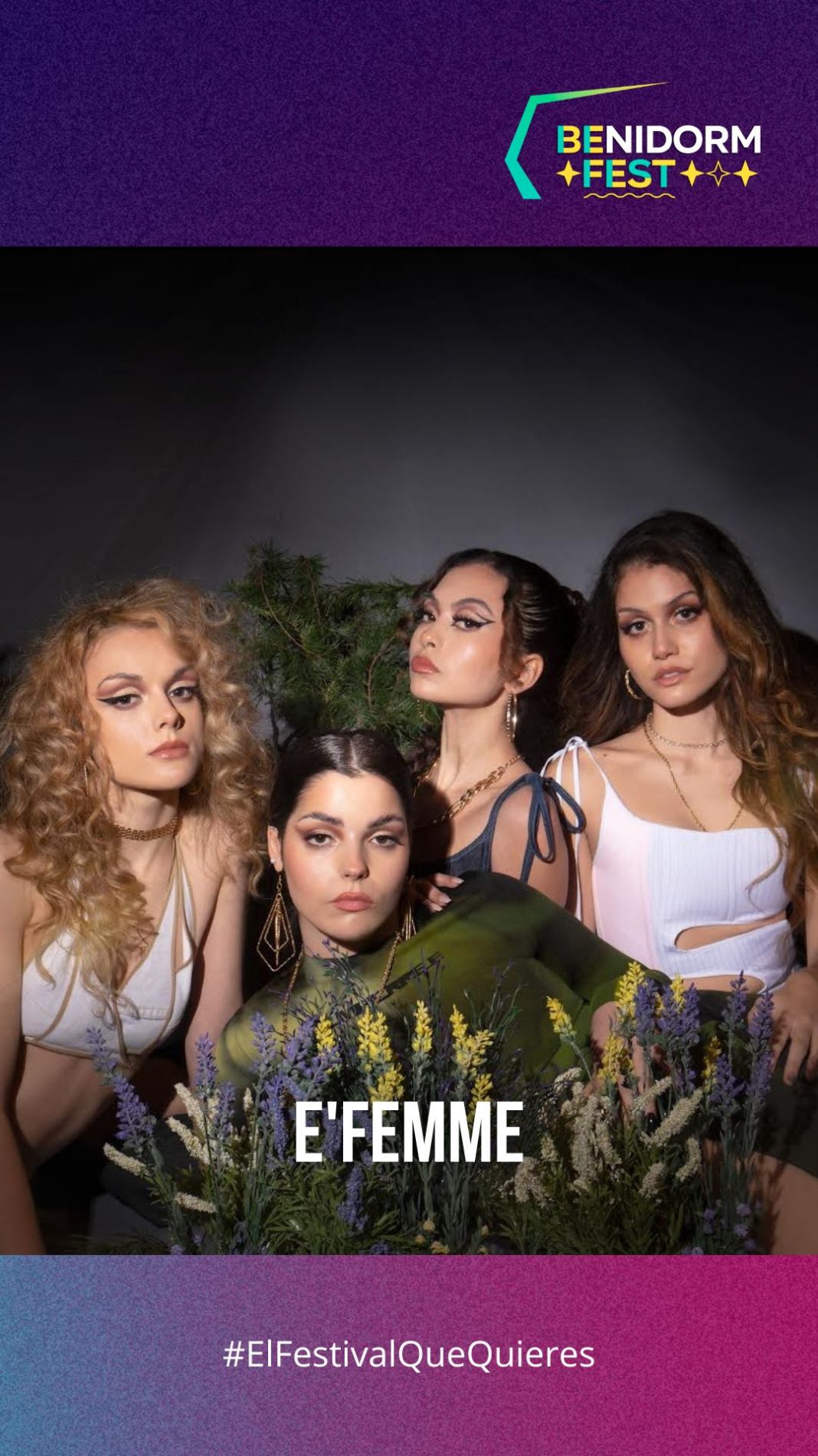 Nuestras segundas candidatas con más papeletas para ganar el Benidorm Fest son E’ffemme. Se trata de una girlband española nacida en Madrid en 2019 formada por Sandy (1997), Melania (1998), BUBU (1999) y Lottie (2000). Junto con su productor de confianza Luki y con la ayuda de todos sus amigos, han sido capaces de sacar el proyecto en el que tanto creen adelante. E’FEMME tiene como filosofía el arte como concepto global: música, voz, rap, danza, visuales, moda; cuidar todos y cada uno de los aspectos de su producto. Cuentan con más de 100.000 reproducciones tanto en Spotify como en Youtube, 6k seguidores en TikTok y 3k en Instagram. Con tres singles y videoclips publicados, siguen trabajando por ganarse un hueco en esta industria.
