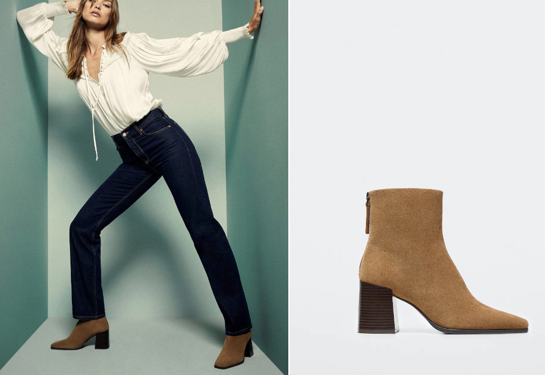 Estos son unos botines con tacón y piel de serraje. El diseño es con punta cuadrada, tacón bloque que mide 5 cm, y cierre de cremallera en la parte posterior. Pertenece a la Colección Committed. Están fabricadas con 96% piel bovino y 4% poliéster. Las consigues en Mango en las tallas que van desde el 35 al 42 y a un precio de 49,99 euros.