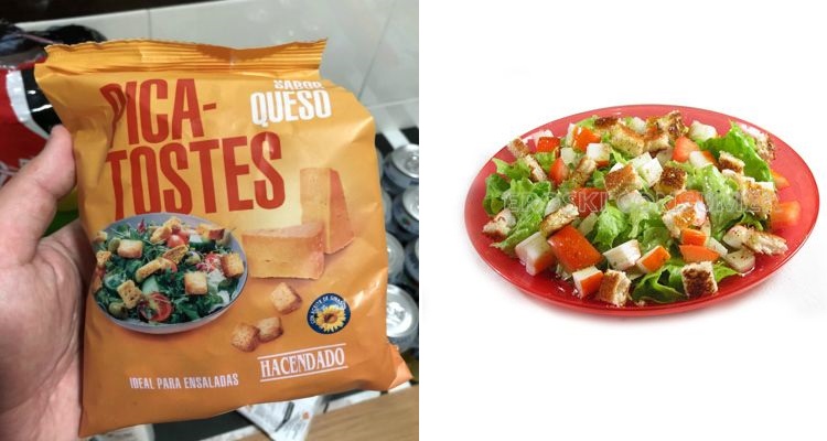 Los picatostes de pan en las ensaladas siempre le han dado un toque especial, haciendo de ellas un producto delicioso y crujiente. Ahora, imagínate que esos picatostes tienen un ligero sabor a queso, el cual también pega muy bien en este plato. Pues hay un producto de Hacendado que es justo eso, unos picatostes con sabor a queso.