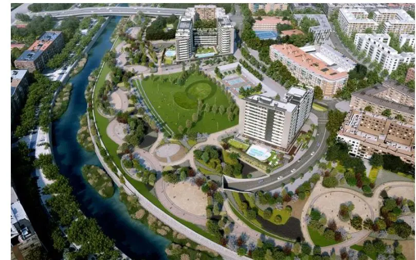 La sombra del que fuera estadio de fútbol del Atlético de Madrid, el Vicente Calderón, aún es alargada, pero en los antiguos terrenos de los colchoneros comienza a salir el sol. Estos terrenos, tras su cesión, ya toman forma. De hecho, algunas de las nuevas promociones ahora en construcción, y a punto de finalizar, ya han sido comercializadas al 80%. La promotora Gestilar prevé la entrega de las primeras viviendas a lo largo del próximo 2023.