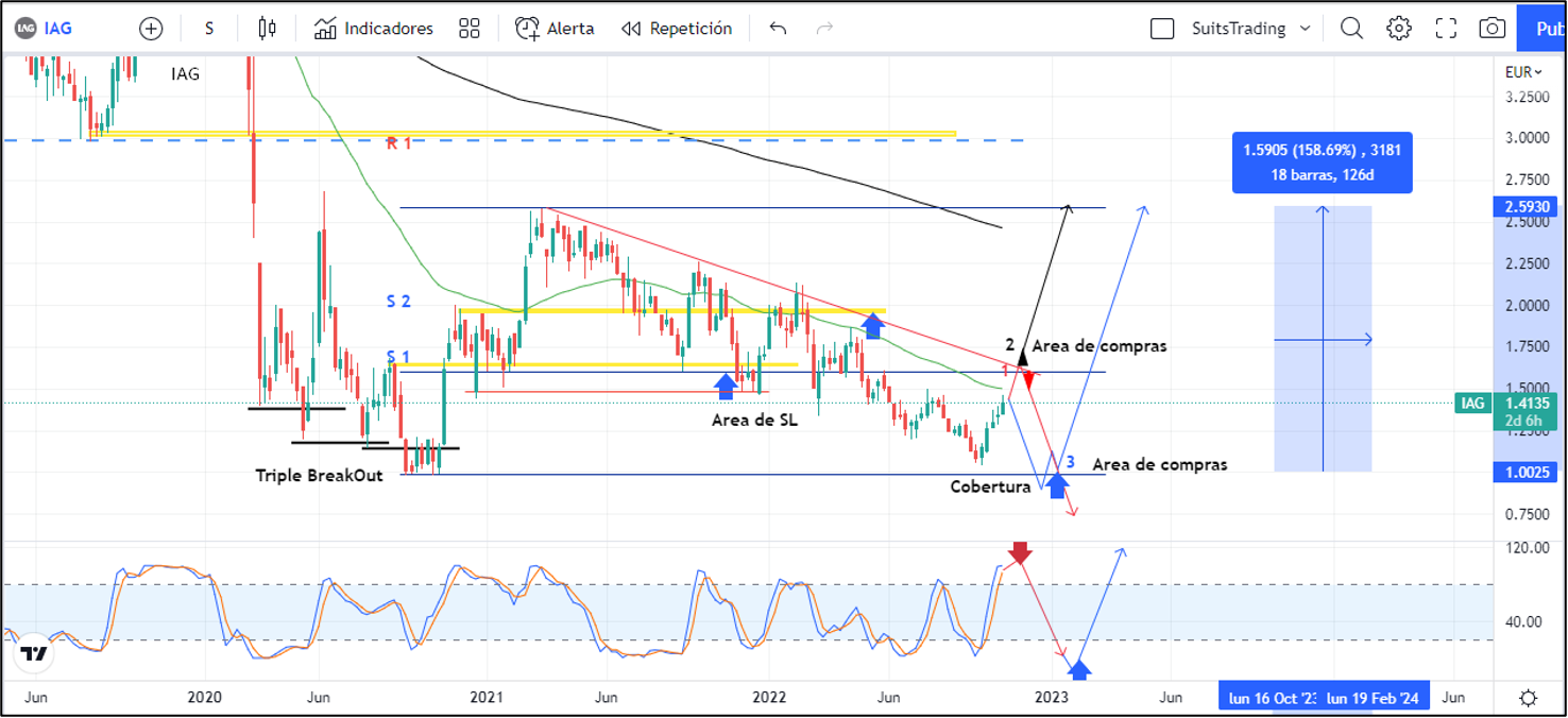 Sin embargo, ante el escenario actual macroeconómico y la incapacidad del volver a los niveles previos a las pandemia, la estructura de las acciones de IAG nos presentan tres hipótesis a considerar. La primera, es un posible movimiento adicional al alza hasta inmediaciones de 1,63 euros donde se encontraría con la directriz bajista y la resistencia de septiembre de 2021. Al visitar y respetar la directriz, podría realizar un movimiento de caída de más de un -40% registrando nuevos mínimos a los alcanzados por la pandemia.
