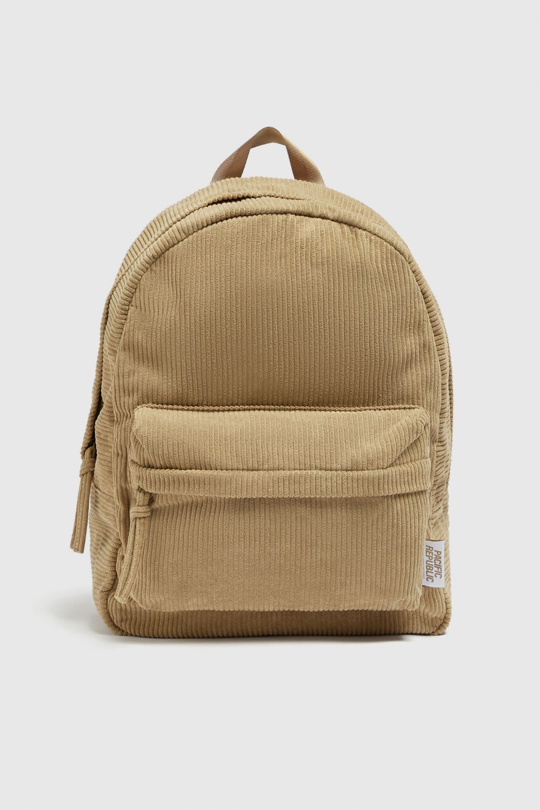 Una buena solución cuando tienes que llevar muchas cosas, es escoger una mochila. Esta que te mostramos, es de pana, así que es un modelo muy adecuado para el otoño y el invierno, y tiene un tamaño perfecto.