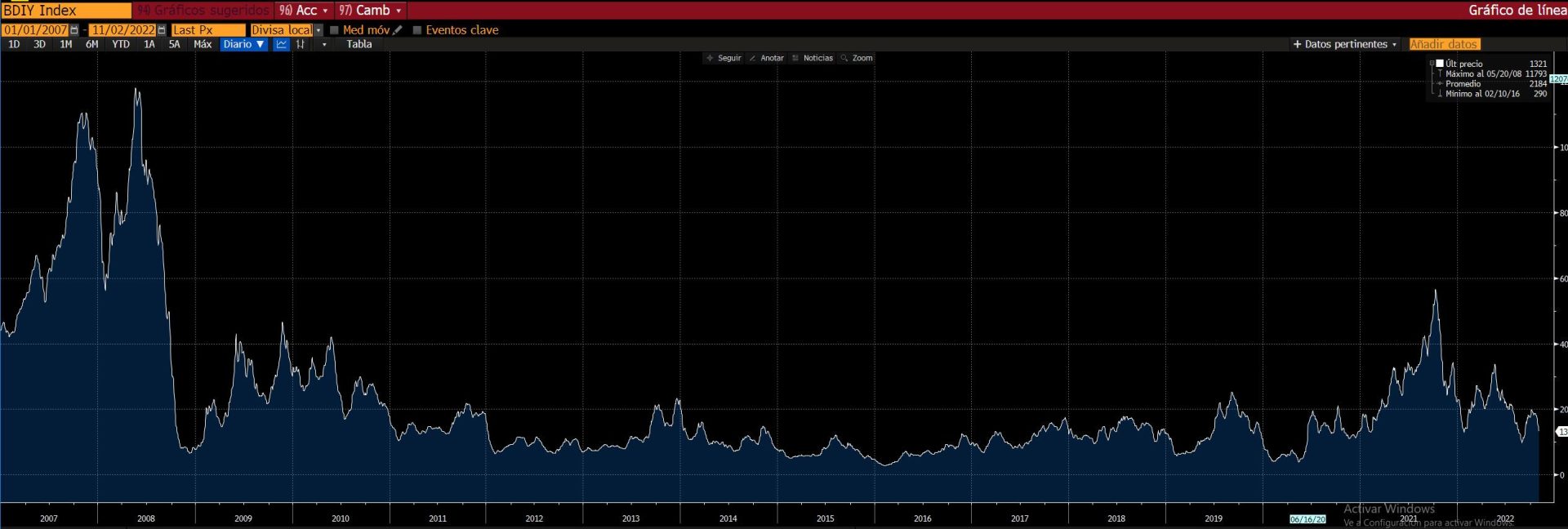 El Baltic Dry Index registra una «tendencia claramente negativa desde octubre de 2021, cuando alcanzó los 5.638 puntos», ha sostenido Ávila. En este sentido, el desplome alcanza el 76,5% desde los niveles de hace un año. Esta fortísima caída apunta a una caída no sólo de la demanda mundial, sino anticipa una crisis económica. La situación se debe a «la fuerte inflación junto con la subida de tipos de interés frenan la actividad económica y por lo tanto, reducen los envíos de bienes en todo el mundo».